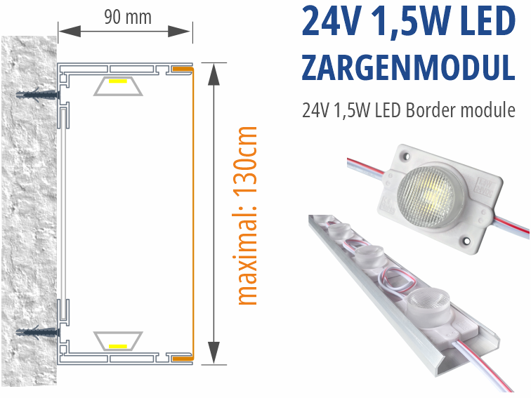 Sehr homogene Ausleuchtung bei seitlicher Einstrahlung bis zu einer Höhe von 130cm (90mm Bautiefe) ca. 12 Module pro Laufmeter. 20 Stück vorverkabelt, das ist auch das Limit pro Zuleitung. Die Module sind in Leuchtkästen sowohl im Innen als auch im Aussenbereich einsetzbar.
