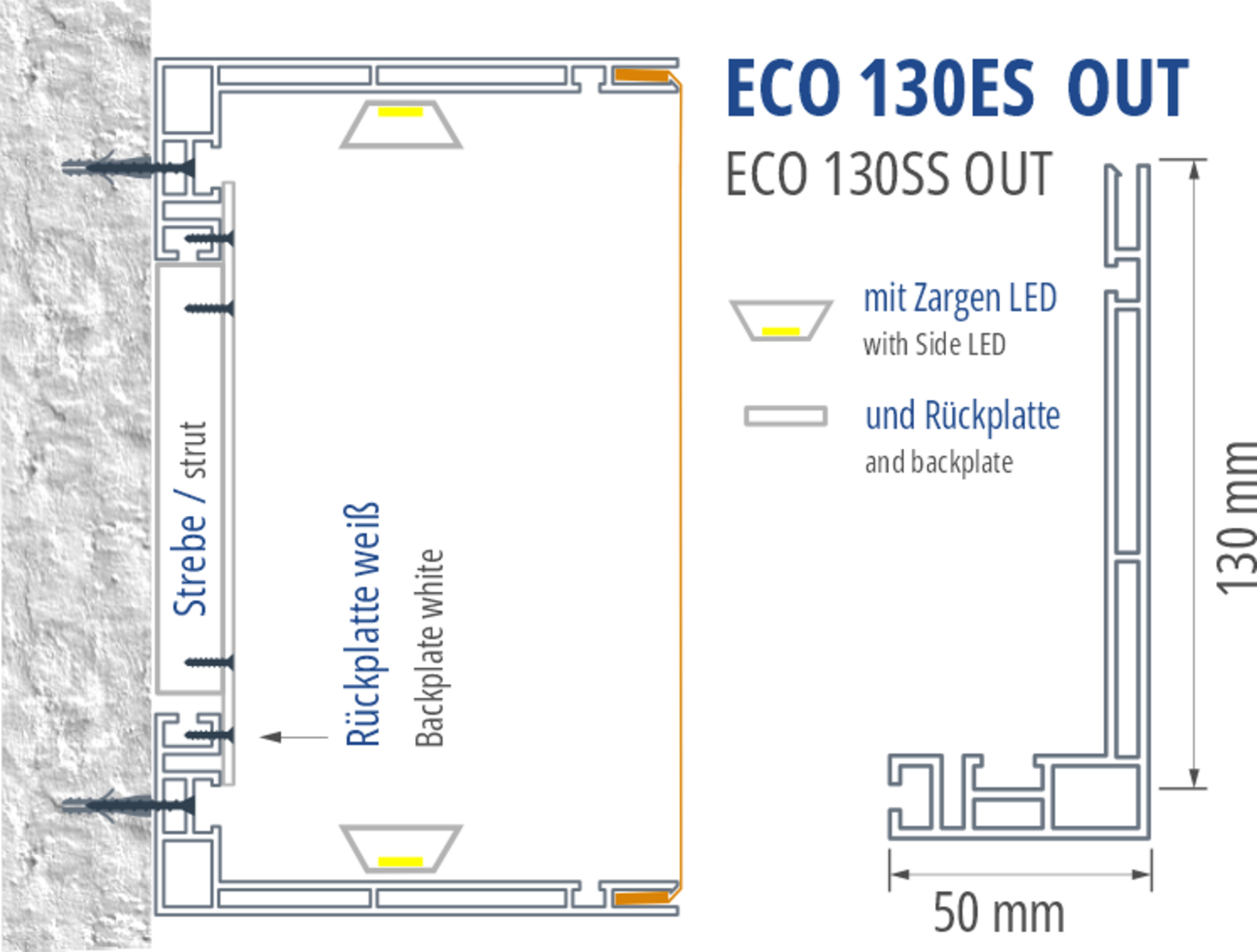 Das Eco 130es OUT ist ein eloxiertes Aluminiumprofil für große einseitige LED-Leuchtrahmen im Außenbereich. Die integrierte Gummilippentechnik mit Widerhaken sorgt für sichere Tuchverankerung auch bei Wind. Das Profil verfügt über einen eigenen Schraubkanal und wird alle 30-70 cm direkt an der Wand oder Unterkonstruktion verschraubt. Die tiefe Flachbandnut mit Widerhaken nimmt Spanntücher mit Gummilippe auf. Nach der Profilmontage kann eine weiße Rückwand als Spanntuch eingesetzt werden. Verstrebungen lassen sich über Schnellspannschlösser befestigen. Mit 2,8W LED-Modulen erreicht das Profil homogene Ausleuchtung bis 3 Meter, mit Ultra LEDs sogar bis 5 Meter. Der Widerhaken sichert das Spanntuch zuverlässig gegen Sturmeinwirkung. Geeignet für mittlere und große Fassadenwerbeanlagen, Schilderanlagen und LED-Leuchtrahmen im gewerblichen Außeneinsatz.