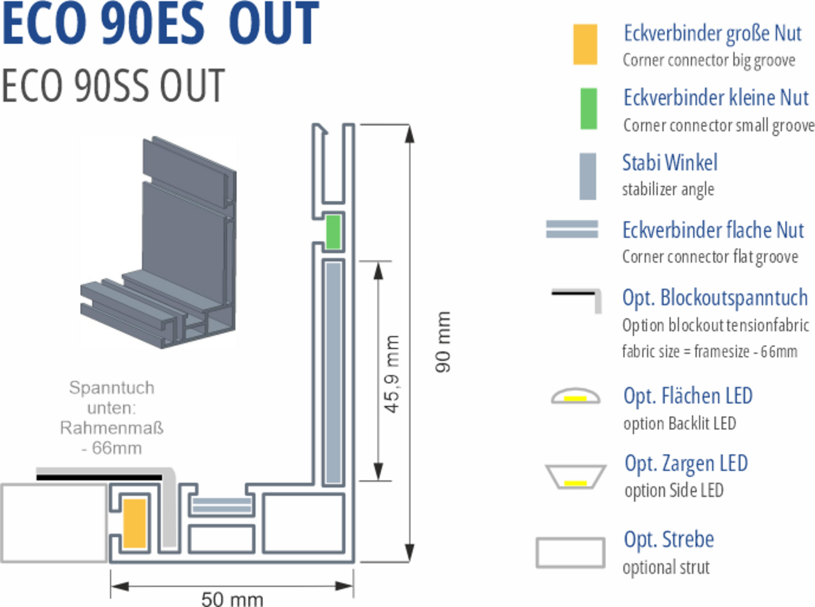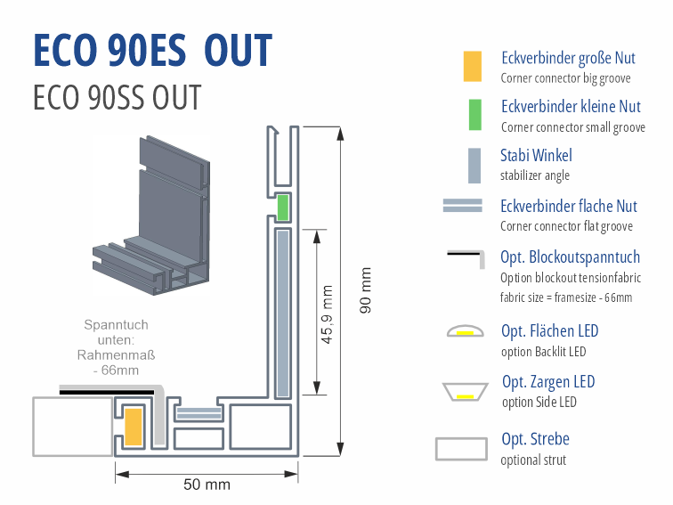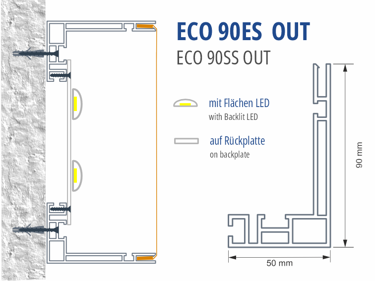 Gummilippentechnik für den Außenbereich mit vertiefter Flachbandnut und Widerhaken zur Tuchverankerung. Zur Installation mittlerer und großer einseitiger LED-Leuchtwerbeanlagen an Fassaden oder geeigneten Unterkonstruktionen. Das Profil wird direkt an der Wand verschraubt. Als Rückplattenersatz kann ein Blockoutspanntuch mit Gummilippe eingesetzt werden. Verstrebungen werden mit Schnellspannschlössern aufgenommen.