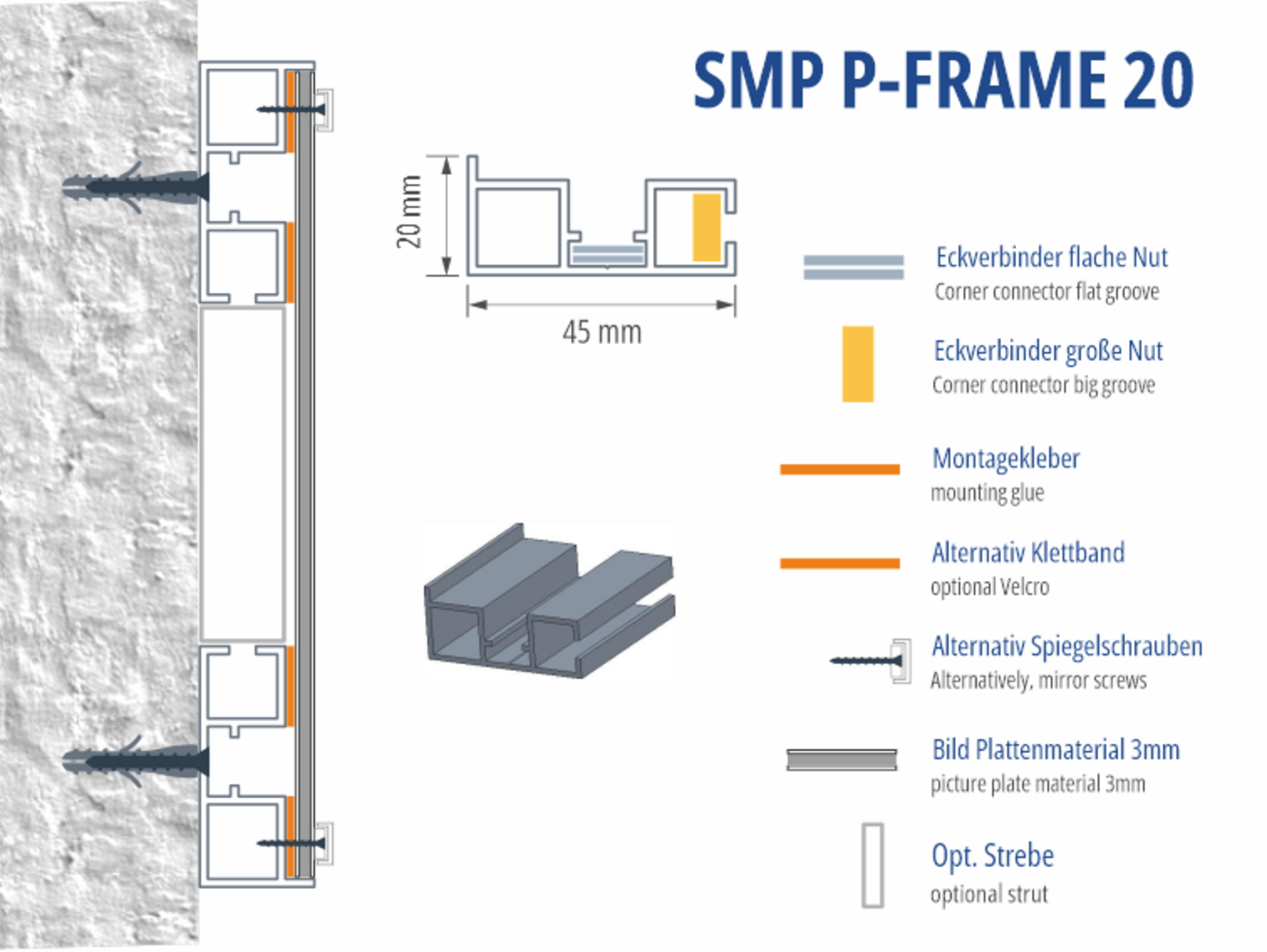 Die Platten werden sauber im Rahmen eingefasst. Das Profil kann zusätzlich verstrebt werden. Es gibt zwei Klebeflächen für 1,5cm breites doppelseitges Klebeband. Für große Anwendung kann die Platte auch auf den Streben verklebt werden.
