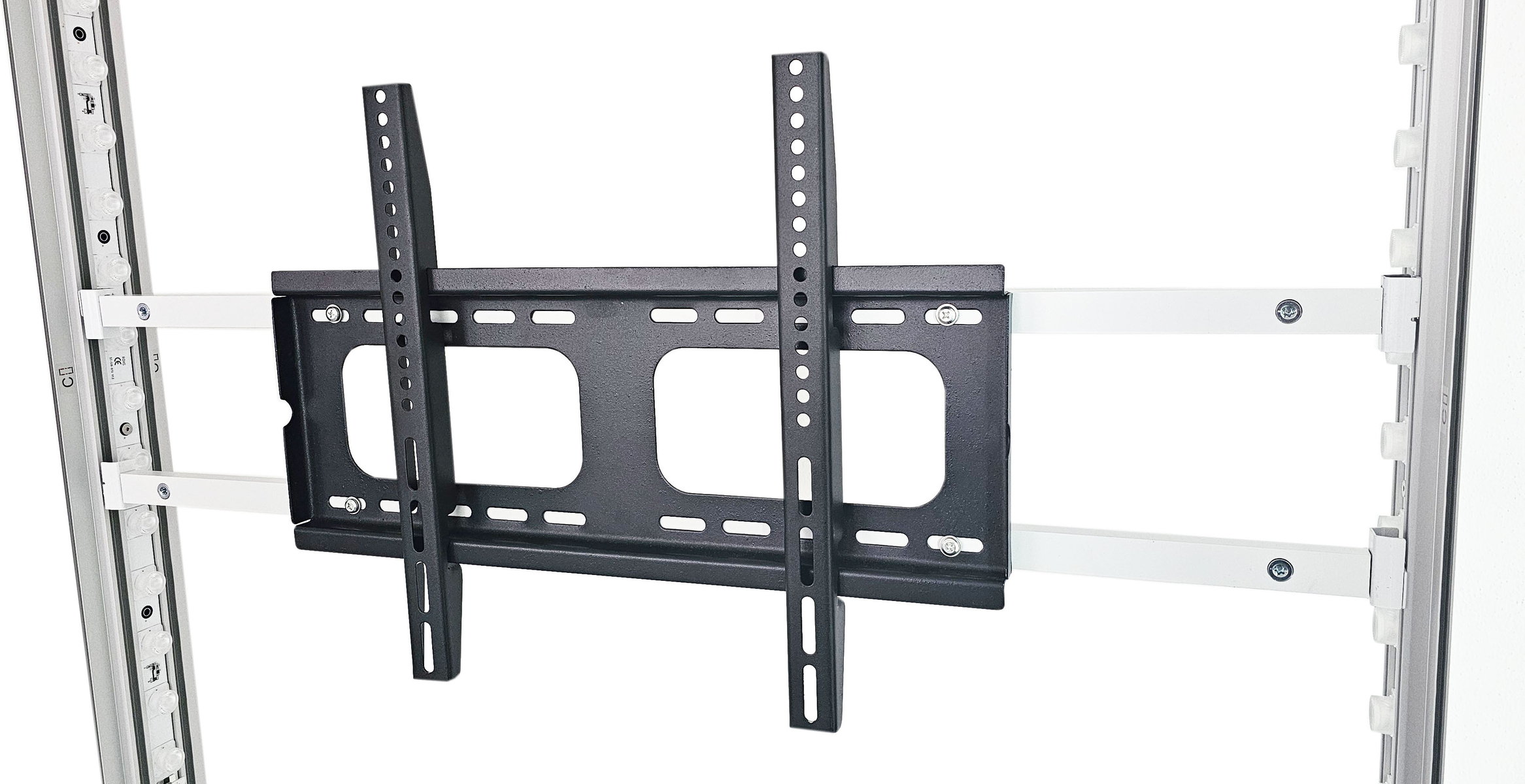 Set zur Montage von Monitoren auf die 2m hohen Bruno Systeme. Bestehend aus 2 Querstreben mit Schlössern, Montageadaptern und der Monitorhalterung mit allen Schrauben.