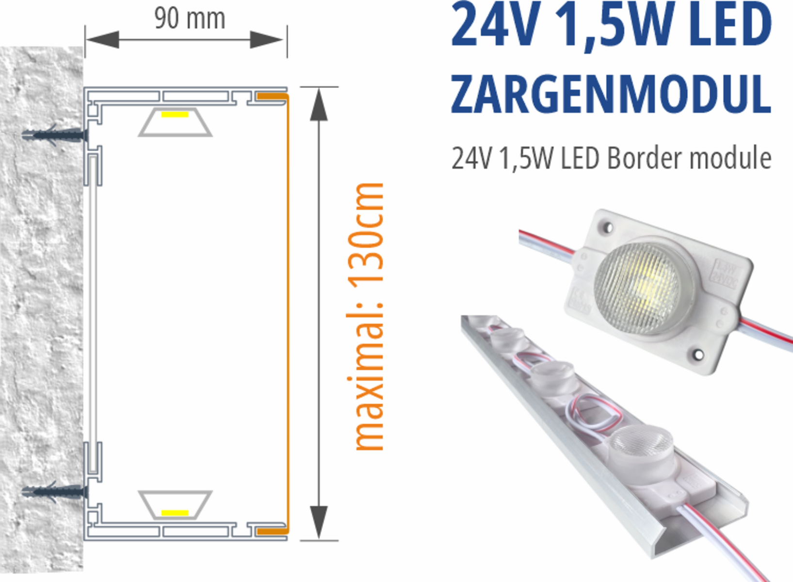 Sehr homogene Ausleuchtung bei seitlicher Einstrahlung bis zu einer Höhe von 130cm (90mm Bautiefe) ca. 12 Module pro Laufmeter. 20 Stück vorverkabelt, das ist auch das Limit pro Zuleitung. Die Module sind in Leuchtkästen sowohl im Innen als auch im Aussenbereich einsetzbar.