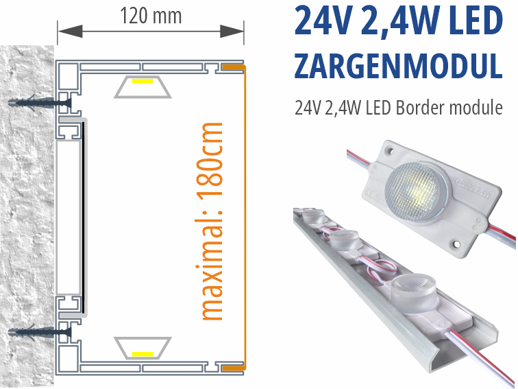 Das 24V LED-Zargenmodul bietet eine Leistung von 2,4 W je Linse und eine Lichtleistung von 200 Lumen pro Modul in der Farbtemperatur 6500K. Es eignet sich ideal für den Einsatz in einseitigen Profilen ab Eco90es sowie in doppelseitigen Profilen ab Eco130bs, jeweils bei einer Einstrahltiefe von 130–150 cm.Die Module sind nach jedem Segment teilbar, was maximale Flexibilität bei der Montage ermöglicht. Eine direkte Dimmung per PWM ist problemlos möglich und erlaubt eine einfache Helligkeitsregelung über gängige Controller. Für eine schnelle Vorinstallation ist die Rückseite mit doppelseitigem Klebeband ausgestattet. Zusätzlich ist das Modul kompatibel mit LED-Rail-Systemen, wodurch die Montage noch effizienter und sauberer erfolgt.Empfohlen werden etwa 10 Module pro Meter, um eine gleichmäßige und professionelle Ausleuchtung der Leuchtkästen zu gewährleisten. Das LED-Zargenmodul überzeugt durch seine hohe Effizienz, einfache Handhabung und optimale Lichtverteilung für Anwendungen in der Werbetechnik.