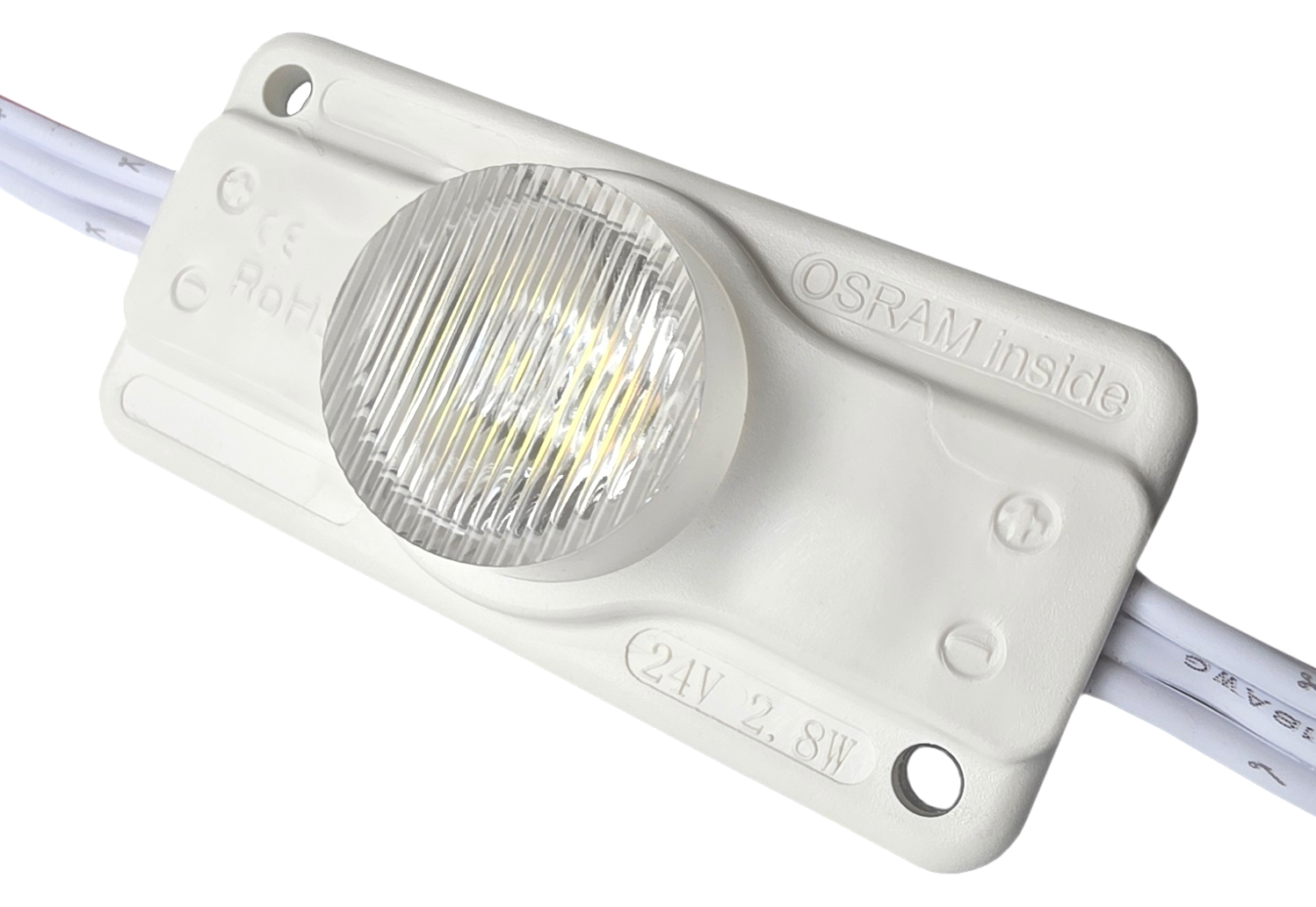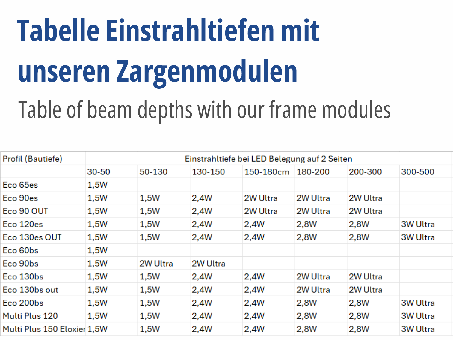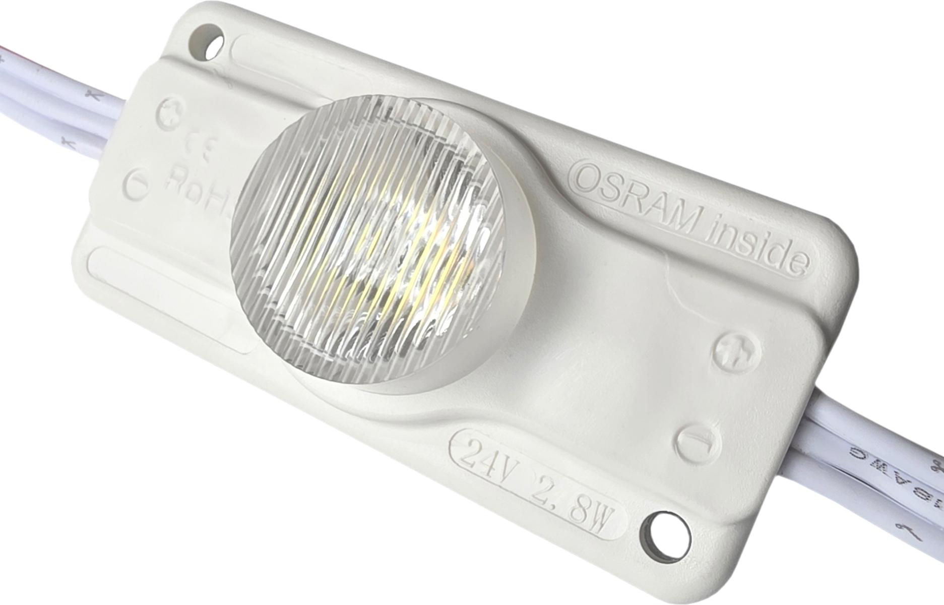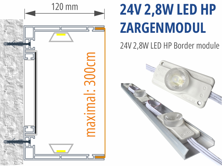 Das 24V LED-Zargenmodul bietet 2,8 W je Linse und eine Lichtleistung von 200 Lumen pro Modul bei einer Farbtemperatur von 6500K. Mit seiner IP67-Schutzklasse ist es sowohl für den Innen- als auch den Außenbereich bestens geeignet. Empfohlen werden etwa 9–10 Module pro Meter, um Leuchtkästen gleichmäßig und zuverlässig auszuleuchten. Die Module sind nach jedem Segment teilbar und bieten dadurch maximale Flexibilität beim Einbau. Sie eignen sich ideal für den Einsatz in einseitigen Profilen ab Eco 120es sowie in doppelseitigen Profilen wie Eco 200bs, jeweils bei einer Einstrahltiefe von 150–300 cm. Über die separate Dimmleitung kann die Helligkeit komfortabel per 1–10V-Controller geregelt werden – eine PWM-Dimmung direkt über die Zuleitung ist nicht vorgesehen. Für eine schnelle Vorinstallation ist die Rückseite mit doppelseitigem Klebeband ausgestattet; alternativ ermöglicht die Kompatibilität mit LED-Rail-Systemen eine besonders effiziente Montage. Das Modul überzeugt als langlebige und energieeffiziente Lösung für professionelle Leuchtkasten-Anwendungen.