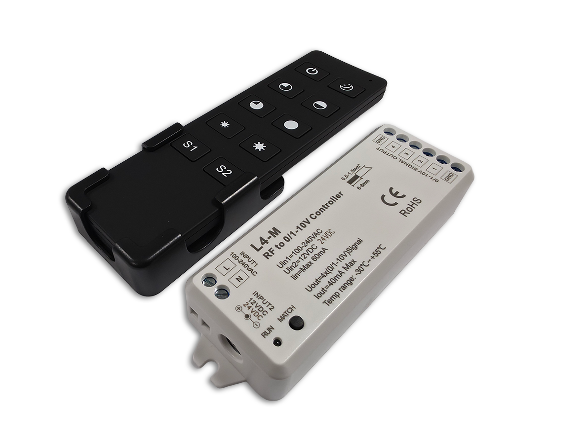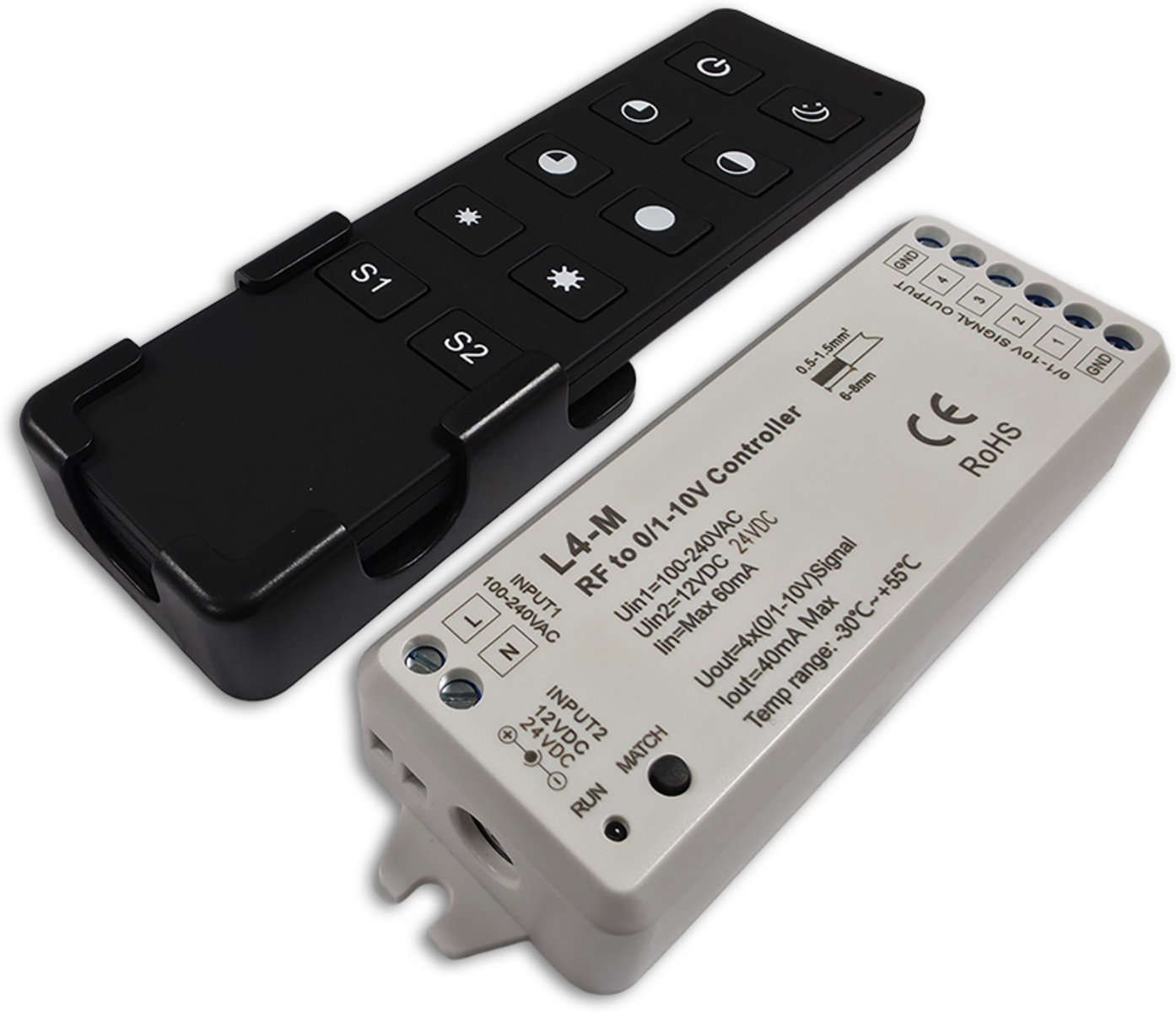 Gibt an je vier Ausgangskanälen eine 0-10V DC Steuerspannung aus. Der AUsgang wird diekt mit der Dimmleitung der LED Module verbunden.