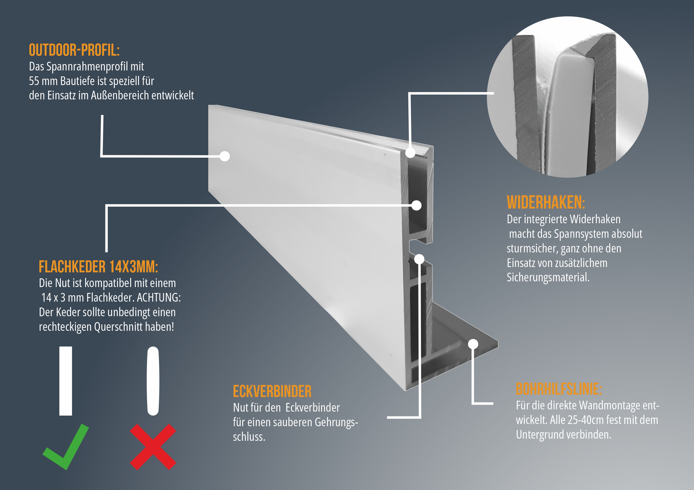Das Profil für superschlanke, beleuchtete Gummilippenspannrahmen im AUSSENBEREICH! Der Widerhaken am innenliegenden Steg sorgt für absolut sicheren Halt des Spanntuches OHNE jegliche zusätzliche Sicherung!